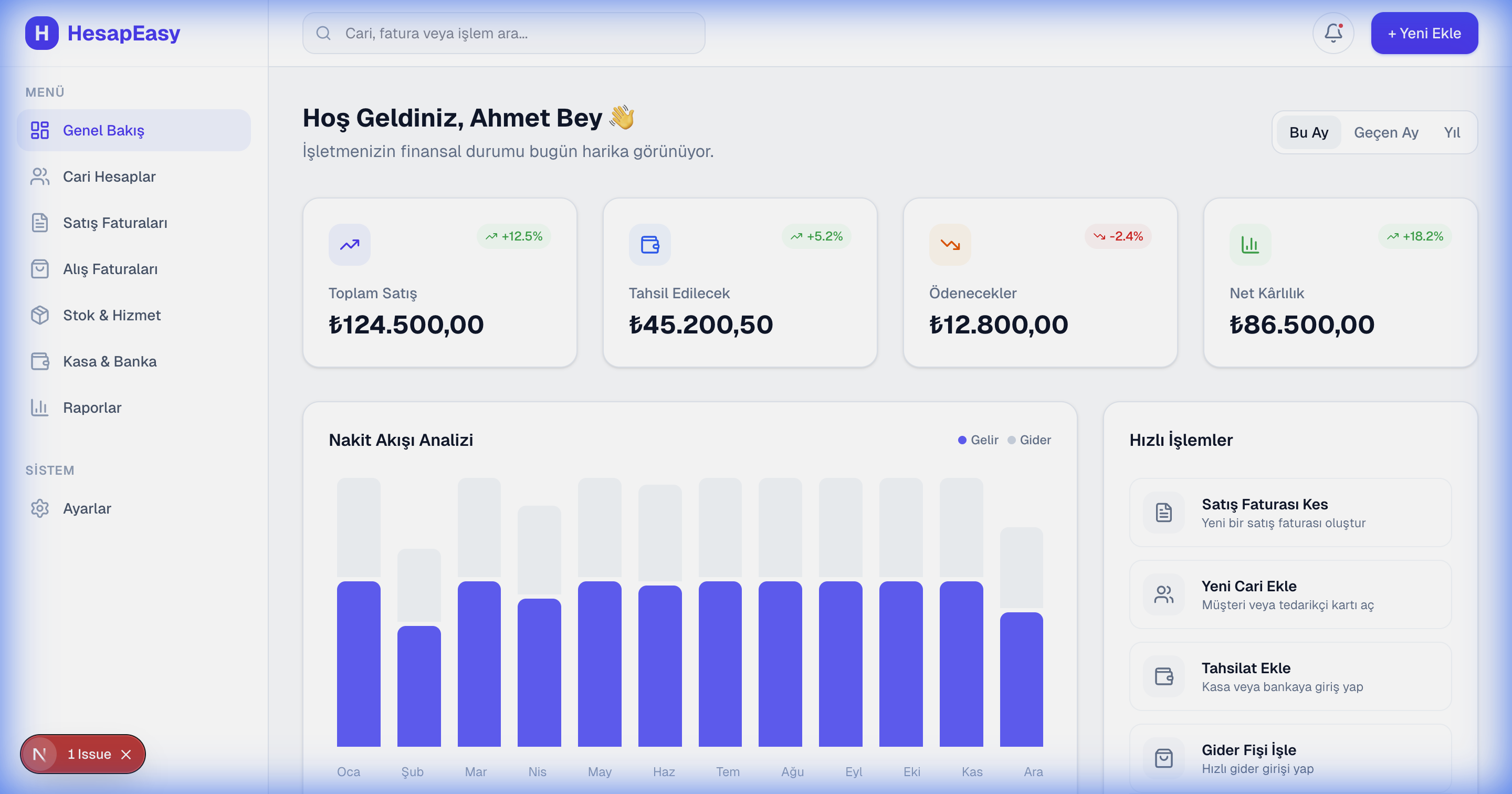 HesapEasy ile sadece fatura kesmezsiniz; tüm finansal operasyonunuzu tek bir yerden yönetirsiniz.